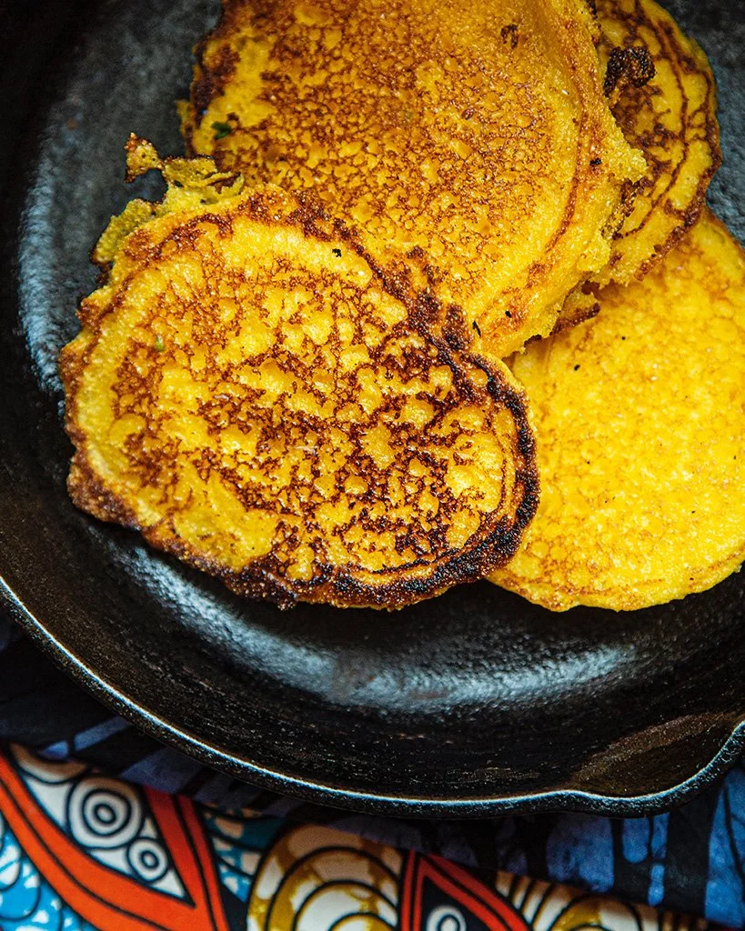 3. Heat a cast iron skillet over medium heat and add a teaspoon of bacon grease. When it shimmers, scoop 2-tablespoon portions of batter into the pan and spread to make approximate 3-inch cakes. Cook until golden brown and crispy, 2 to 3 minutes per side.